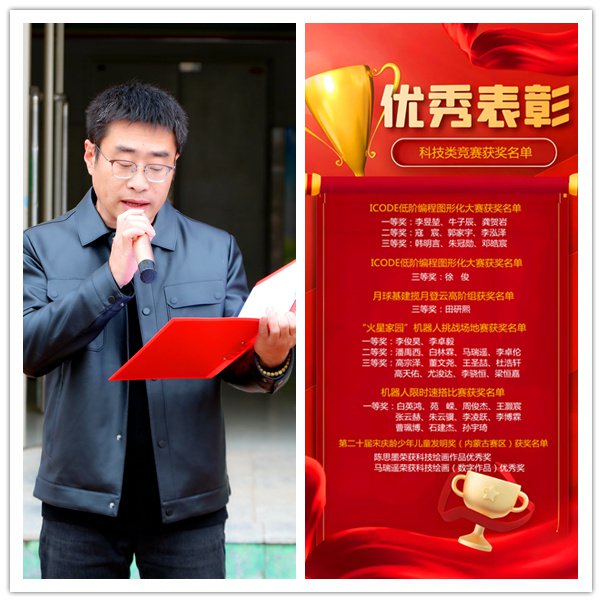 仪式现场还宣读了获奖名单,对2025年各级各类科技竞赛中表现优异的同学进行表彰。在ICODE编程大赛、月球基建揽月登云竞赛、“火星家园”机器人挑战赛、机器人限时速搭比赛及第二十届宋庆龄少年儿童发明奖(内蒙古赛区)中,李昱堃、李俊昊、马瑞遥等同学凭借出色表现斩获佳绩,其中马瑞遥的作品更入选国赛作品展。全场掌声不断,向这些勇于创新的“小小科学家”致敬。