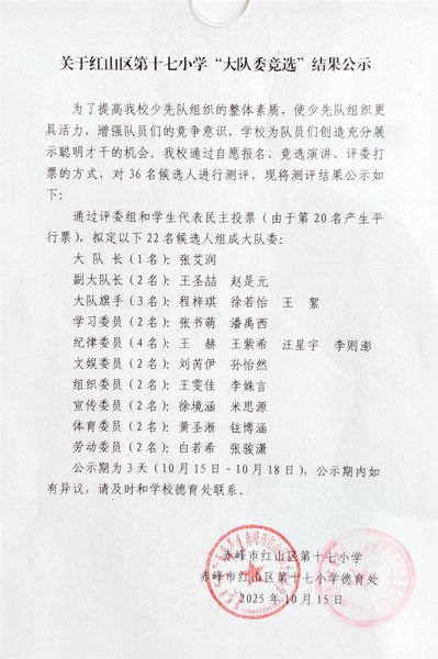 学校严格执行5天公示制度,接受全体师生监督及意见反馈。公示期间未收到任何异议或不良情况反映,充分体现选举过程的公正透明,彰显了学校少先队组织的权威性与公信力。